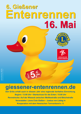 Am 16.05.2015 veranstaltet der Lions Club Gießen – Justus von Liebig nun bereits das 6. Gießener Entenrennen in Kooperation mit dem Hessischen Turnverband im Rahmen des 15. Hessischen Landesturnfestes vom 13.–17. Mai 2015 in Gießen.