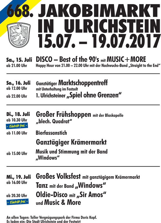 Das Programm am Sonntag beginnt ab 12.00 Uhr mit dem ganztägigen Marktschoppentreff mit Unterhaltung im Festzelt und um 13.00 Uhr fällt der Startschuss zum 1. Ulrichsteiner "Spiel ohne Grenzen" aller Stadtteile.